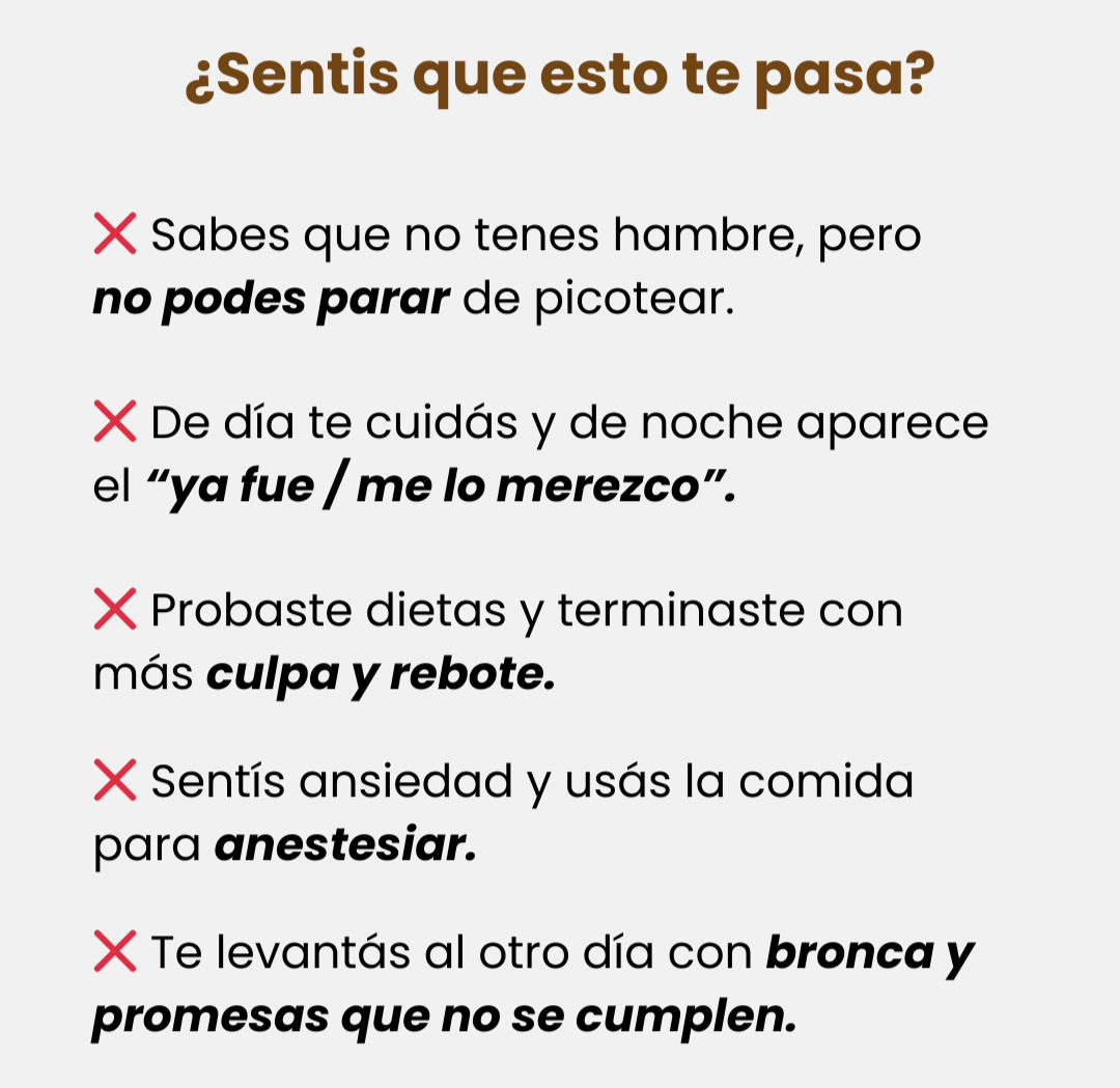 No. Vas a trabajar ansiedad, elección consciente y hábitos sostenibles. Nada de prohibidos.