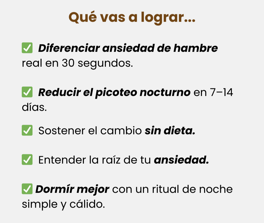 “Tres noches seguidas sin abrir la heladera. La pausa de 2 minutos y la escala ansiedad–hambre me ordenaron. Si estoy en 4/10 hago infusión; si estoy en 7/10, como algo simple. Me levanté sin culpa.”
